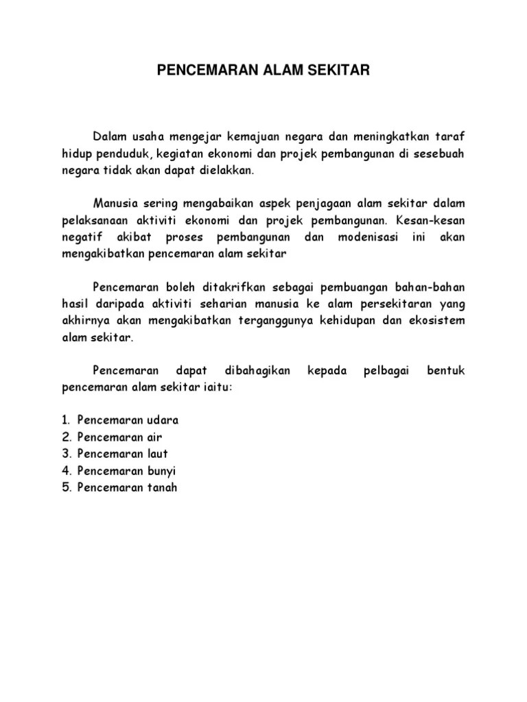 Mereka nyatakan seharusnya tiada pencemaran pada alam sekitar. Click for more detailed english meaning translation, meaning, pronunciation and example sentences. Pencemaran udara in english : Can cause, environment, love nature, discard chemicals.